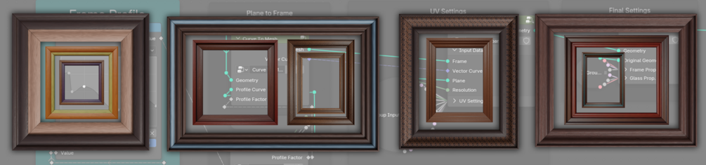 This node setup is applied to a plane with an image, generating a frame around its perimeter. You can customize the moulding profile, width, glass presence, and more. The main settings are displayed in the modifier panel.